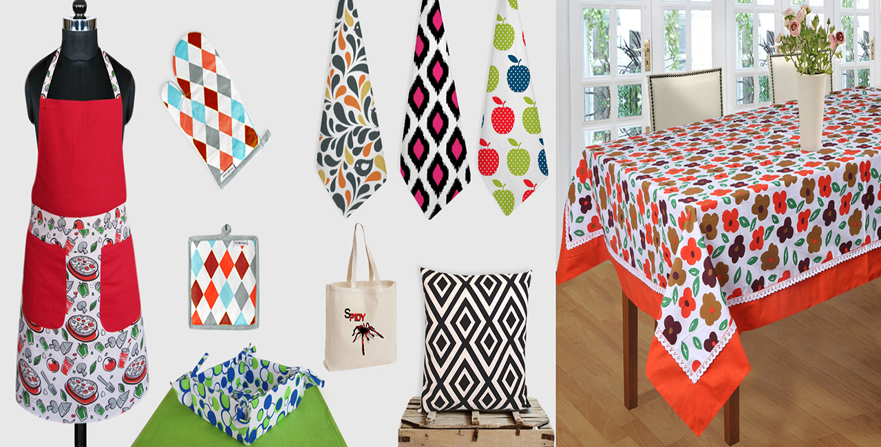 Table Cloth, Table Mat, Table Runner, Fruit Basket, Napkin, Dining Chairpad, Kitchen Towel, Oven Glove, Pot Holder, Micro Mitten, Double Oven Glove, Apron, Curtains, Valence, Tiers, Swag, Cushion & Cover, Pouf, Floor Matters, Sofa Cover, Bolster, Bed Spread, Duvet Cover, Pillow Case